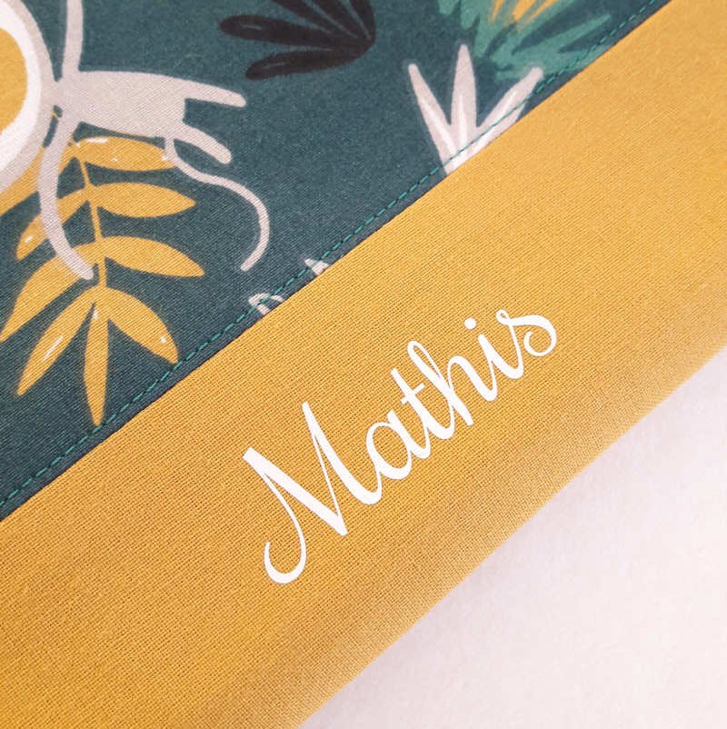 Suite à votre commande, je vous enverrai les styles d’écriture possibles. Si vous avez choisi l’option « Autre tissu imprimé » je vous montrerai les associations de tissus unis possibles.